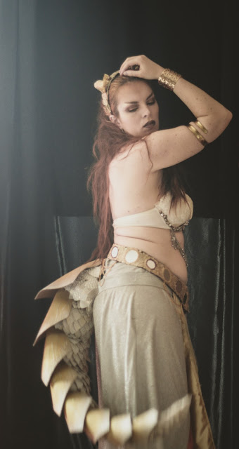 La première chose un peu nécessaire était d'avoir le dragon. J'étais tombée amoureuse des queues articulées de Arborealkey. Je me suis inspirée de ses talents pour créer ma propre queue articulée pour qu'elle puisse danser avec moi. J'ai trouvé un faux-cuir parfait (je voulais un dragon en vieil or, comme au début du film quand on voit les dragons se battre dans la lumière et qu'ils semblent dorés/blancs). Finalement, ce tissu est entre le doré et l'argenté et j'adore l'association des deux.